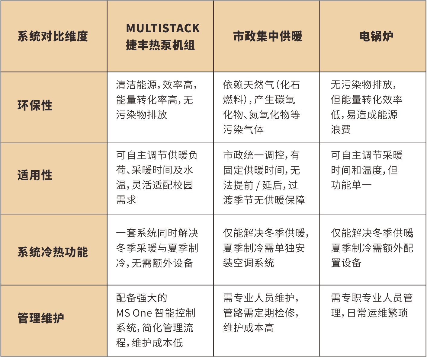 从环保性、适用性到管理维护,MULTISTACK 捷丰热泵机组全方位超越市政集中供暖与电锅炉,为学校提供更优质、更省心的供能选择:
