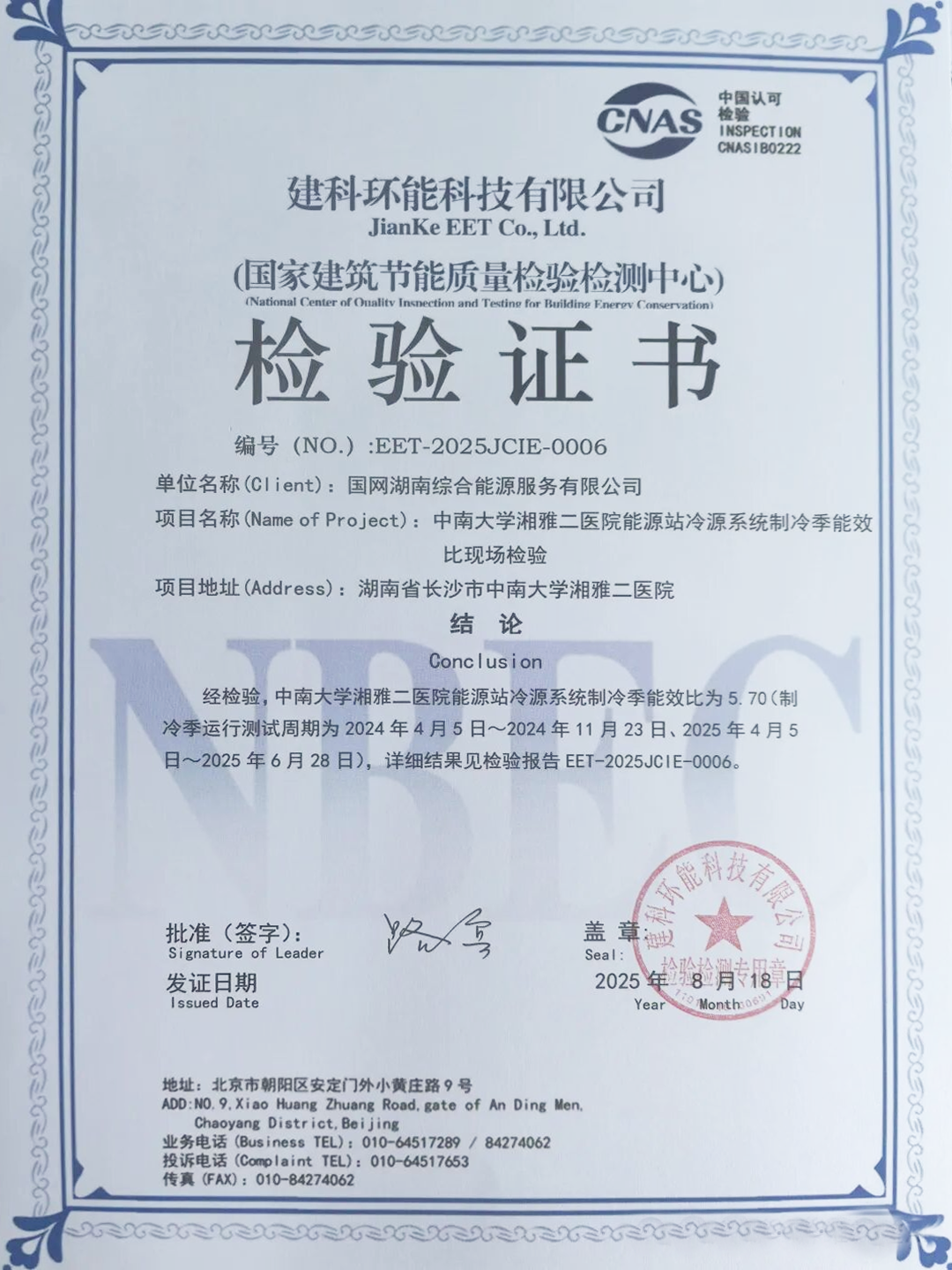国家建筑节能质量检验检测中心(经 CNAS 认可)出具的《检验证书》显示,该项目制冷季综合季能效比 EER=5.70,高于医疗行业空调系统平均水平。这一成果的核心,正是 MULTISTACK 捷丰满液式磁悬浮机组的技术优势:专利磁轴承技术消除机械摩擦,既实现超 40%的节能率,又大幅降低运行噪音,不干扰 ICU、新生儿科等环境敏感区域。这份第三方权威检测报告,成为 MULTISTACK 捷丰磁悬浮技术性能的实力认可。